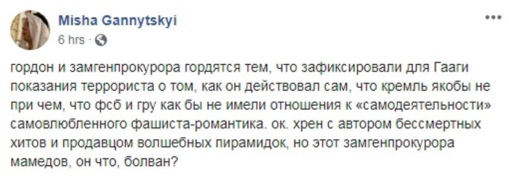 Заместитель генерального прокурора Гюндуз Мамедов уже заявил, что благодарен Дмитрию Гордону за интервью с бывшим главарем российских боевиков на Донбассе Игорем Гиркиным (Стрелковым). "Каждый выполняет свою работу. Журналист берет интервью, а я, как прокурор, отвечающий за расследование военных преступлений, анализирую сказанное и исследую факты. Поэтому в данном случае могу выразить лишь благодарность, а не критиковать за те показания, которые услышало наше общество и правоохранительные органы. В том числе и о катастрофе самолета MH17", – сказал Мамедов.