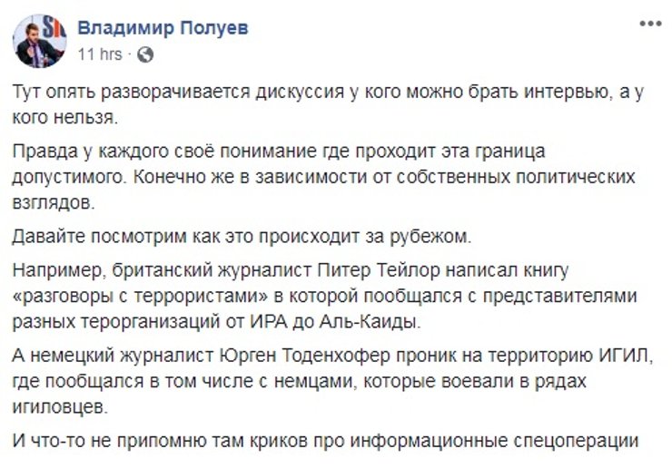 Многие еще до объяснений Гордона высказались на тему его "гостя" и заявили, что это и есть свобода слова. И ранее в истории уже бывали подобные прецеденты, когда интервью брали у Усамы-бен-Ладена или условного Гитлера. Мол, как еще узнать врага, если с ним не поговорить?