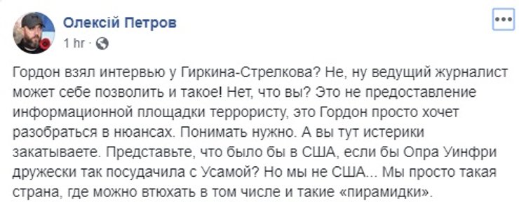 Прозвучали и претензии к тому, как прошло четырехчасовое интервью. Признавая право журналиста на интервью даже с боевиком и убийцей, некоторые пользователи заявили, что оно выглядело не столько обличающим, сколько заискивающим. Мол, улыбаться и льстить врагам нельзя, а Гиркин так и не раскололся и выглядел убедительнее, чем Гордон.