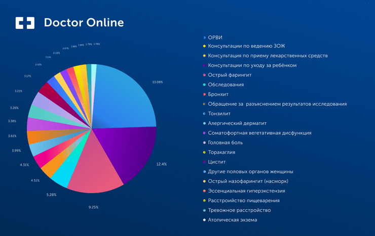 Самое распространенное, с чем обращались к нам во время пандемии - это ОРВИ и ОРЗ. Меньше всего консультаций было по таким запросам как: сердечно-сосудистая патология, интерпретация результатов исследования, травмы.