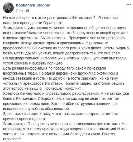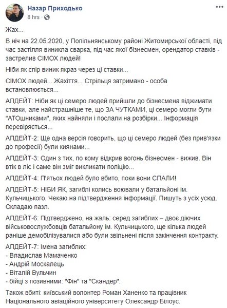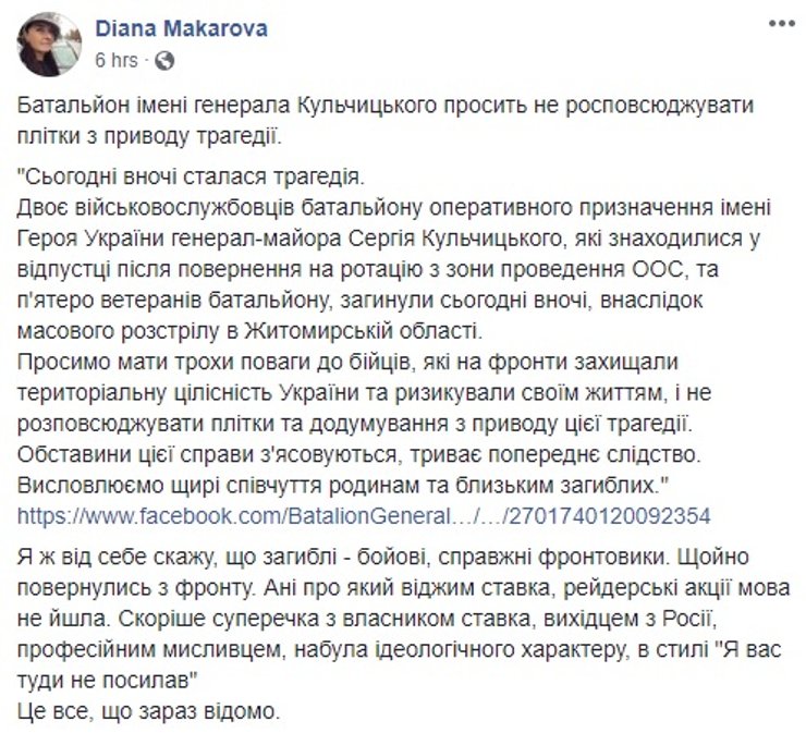 Позже стали появляться подробности. Стали известны имена некоторых убитых. В Национальной гвардии Украины назвали в Facebook фамилии трех своих сотрудников, которые погибли в Житомирской области во время стрельбы возле пруда в районе села Новоселица.