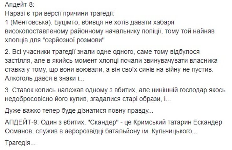 На сайте Нацполиции сообщается, что бойня произошла около часу ночи. К пруду гости прибыли в ночь с 20 на 21 мая. С арендатором они якобы были знакомы и поддерживали "дружеские отношения".