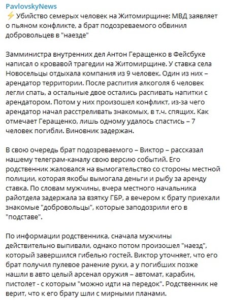 О бойне в селе Новоселица, Попельнянского района, Житомирской области стало известно утром 22 мая из Facebook заместителя министра МВС Антона Геращенко.