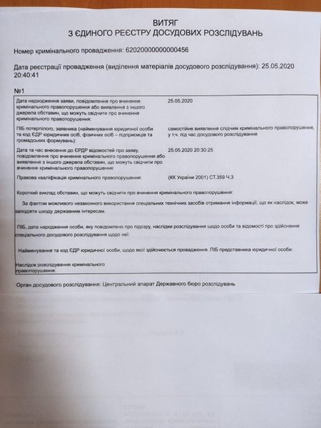 "Незаконное использование технических средств получения информации могло причинить вред государственным интересам", – говорится в извлечении из Единого реестра досудебных расследований о регистрации уголовного производства, скан-копию которого обнародовало издание.