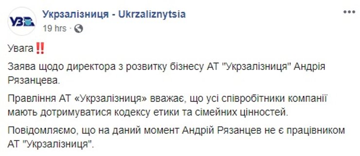 В пресс-службе УЗ заявили, что "все сотрудники компании должны придерживаться кодекса этики и семейных ценностей". "Сообщаем, что на данный момент Андрей Рязанцев – не сотрудник Укрзализныци", – добавили в компании.