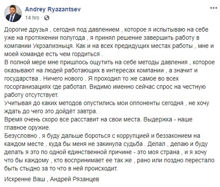 Сам Андрей Рязанцев после своего увольнения ограничился коротким постом, в котором написал, что "принял решение завершить работу в компании Укрзализныця" и что "испытывал давление в течении полугода". О скандале с его участием упомянул косвенно: "учитывая до каких методов опустились мои оппоненты сегодня, не хочу ждать до чего это дойдет завтра".