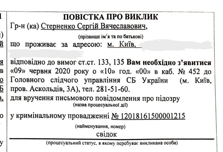 Стерненко сообщил, что уже отправил следователю ответ, что не может явиться в назначенный срок, поскольку, по его словам, вызов получен за два дня до даты допроса, а согласно ст. 135 УПК таковых должно быть минимум три.
