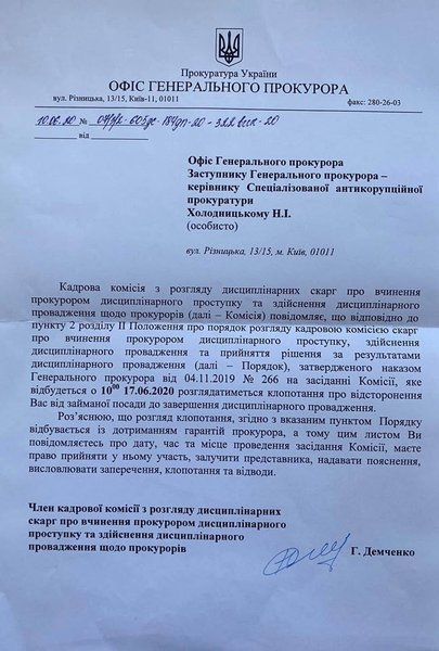 Согласно опубликованному Холодницким документу, известно, что жалоба на него поступила от руководителя Генеральной инспекции Сергея Лисаченко. Сама жалоба имеет гриф "Для служебного пользования", поэтому Холодницкий не знает о ее содержании.