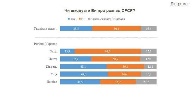 Если на западе страны подавляющее большинство населения не жалеют, что СССР распался (69% против 15%), то в центре соотношение – 51% к 32%, на юге и Донбассе 41,5-49% жалеют против 35-39% не жалеют.