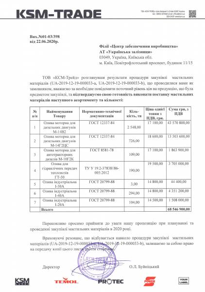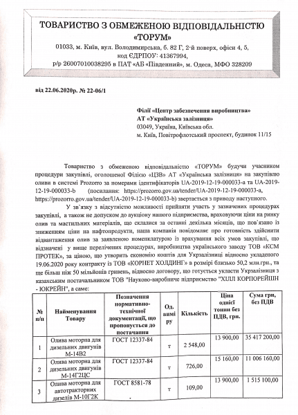 Например, единственной причиной отклонения предложений участников, которые предлагали масла такого известного украинского производителя, как "КСМ-Протек", стало то, что они не загрузили в систему несколько страниц технических условий на изготовление одного из семи закупаемых масел, а поэтому технические показатели предложенного масла якобы не соответствуют требованиям АО "Укрзализныци".