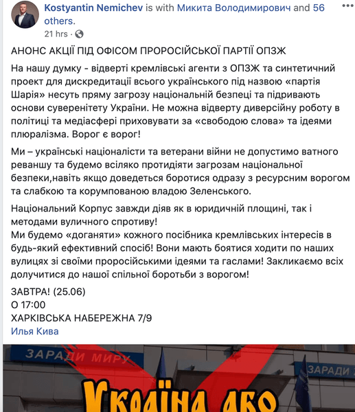 Анатолий Шарий утверждает, что к нападению причастны конкретные люди из Национального Корпуса — Константин Немичев и Максим Жорин. Вчера, 24 июня, Немичев анонсировал у себя в Facebook акцию протеста под офисом ОПЗЖ. В своем посте Константин утверждает, что "кремлевские агенты из ОПЗЖ и синтетический проект для дискредитации всего украинского под названием "партия Шария" несут прямую угрозу национальной безопасности и подрывают основы сувернитета Украины". Кроме того, он пообещал "доганять" каждого политического оппонента любым эффективным способом.