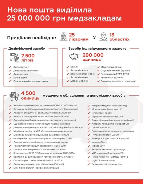 За неполных три месяца крупнейшая частная компания почтовой связи Украины "Новая почта" выделила 25 млн грн на обеспечение больниц оборудованием и средствами индивидуальной защиты в условиях коронавирусной пандемии. 5 июня 2020 года компания доставила финальную партию гуманитарной помощи еще в 11 медучреждений нашей страны