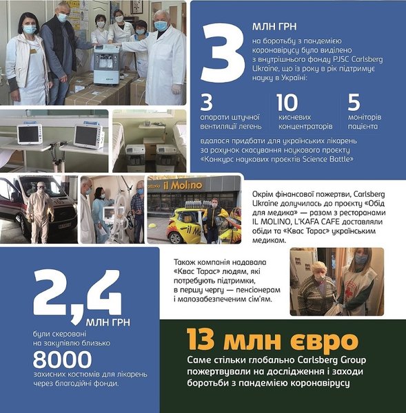 Локально Carlsberg Ukraine надала благодійну допомогу лікарням у вигляді медичного обладнання та допомогла безалкогольною продукцією найменш захищеним верствам населення. Ми продовжуємо підтримку науки і суспільства, але сфокусувавшись у цьому році на медицині: