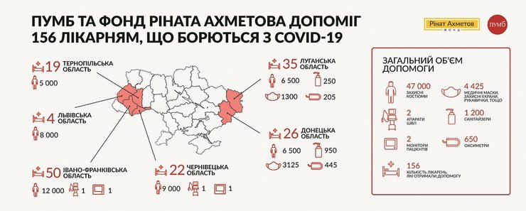 ПУМБ у партнерстві з Благодійною організацією "Фонд Ріната Ахматова" закупив обладнання першої необхідності для медичних закладів заходу та сходу України, а також засоби персонального захисту для лікарів. Банк підтримав 156 лікарень України у 6 областях.