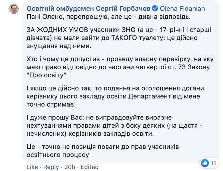Слова коллеги не оценил образовательный омбудсмен Сергей Горбачев. Ответ Елены ему показался странным, а поход в такой туалет для юных особ - унизительным.