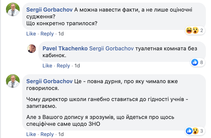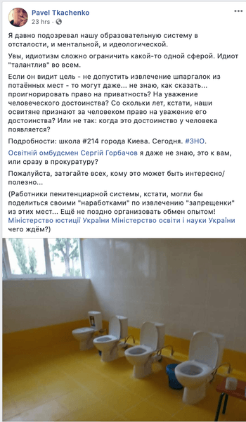 Об этом пишет в своем Facebook Павел Ткаченко. Он рассказал, что его ребенок учился в другом учебном заведении, но ВНО сдавал именно в школе №214.