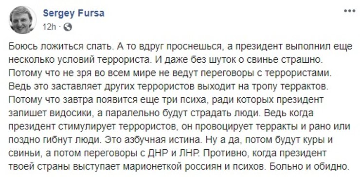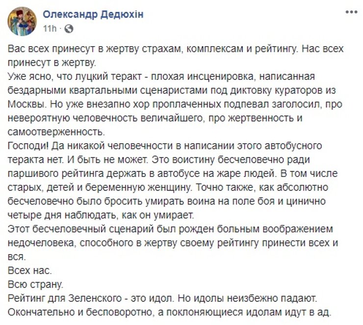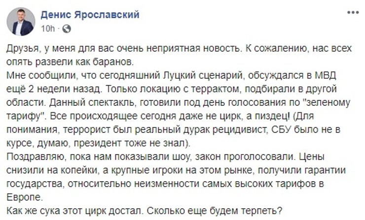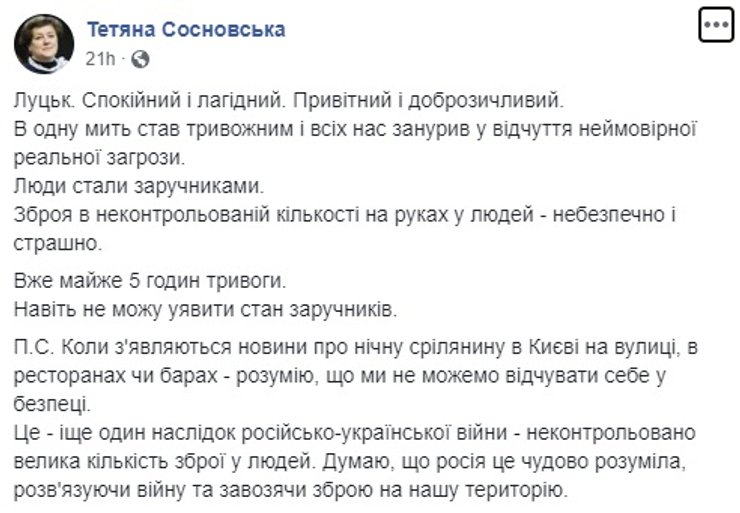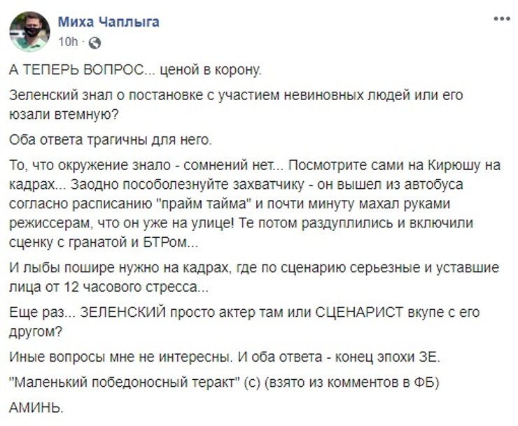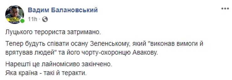 По итогу на уступки пошел только Зеленский. Он, правда, сначала встретился с президентом Швейцарии Симонеттой Соммаругой, сообщил, что взял ситуацию под контроль и отправил в Луцк главу МВД Арсена Авакова. Видеообращение пробыло на странице президента недолго, когда заложники оказались на свободе – он его удалил.
