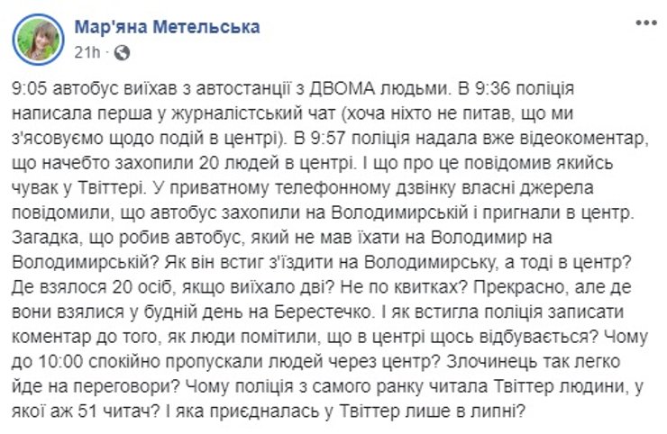 В автобусе были заложники – среди них беременная женщина, пожилые люди и подросток. Кривош не позволял им передавать воду, покидать автобус и не шел на переговоры с полицией. Зато активно общался с журналистами по телефонам заложников и требовал от президента Владимира Зеленского порекомендовать фильм "Земляне" (2005), записать обращение, а от депутатов и даже глав церквей вымогал признания в том, что они "террористы в законе".