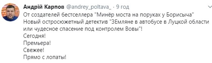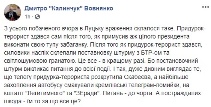 21 июля Максим "Плохой" Кривош захватил автобус и более десяти часов продержал пассажиров на солнцепеке на Театральной площади в центре Луцка без воды и возможности выйти. Все это время он выдвигал требования к президенту, депутатам и духовенству, а уже в сумерках ситуация разрешилась за считанные минуты. В соцсетях считают, что это могла быть спланированная акция