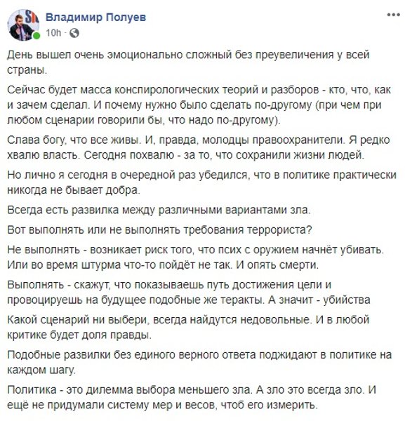 Антон Геращенко, замминистра внутренних дел, пояснил в эфире канала "1+1", что взрывы светошумовых гранат были необходимы из-за возможного оружия под одеждой террориста: "Не было известно, не собрался ли этот человек взорвать гранату или совершить какие-либо другие действия. Под одеждой у него могло быть еще оружие, которое не видно было бы "диванным экспертам" на расстоянии. Поэтому было принято решение психологически подавлять волю преступника через шумовые эффекты и выстрелы", - заявил Геращенко, но конспирологов это объяснение, конечно, не убедило. Хотя многие считают, что правоохранители действовали по закону. И главным образом потому, чтобы не навредить заложникам.
