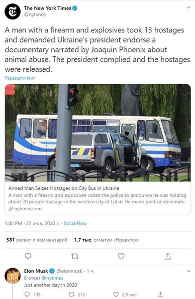 Издание опубликовало пост о захвате автобуса в Луцке. Маск прокомментировал его, написав: "Просто еще один день в 2020 году".