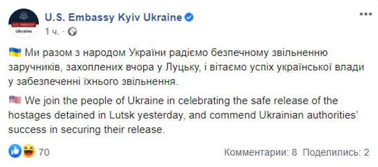 "Мы вместе с народом Украины радуемся безопасному освобождению заложников, захваченных вчера в Луцке, и приветствуем успех украинской власти в обеспечении их освобождения", - написала пресс-служба посольства.