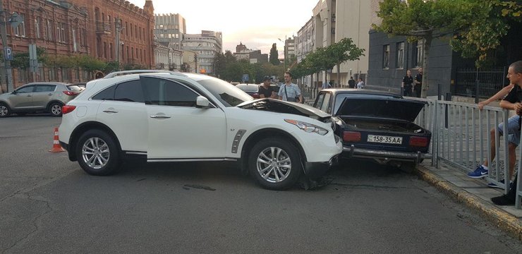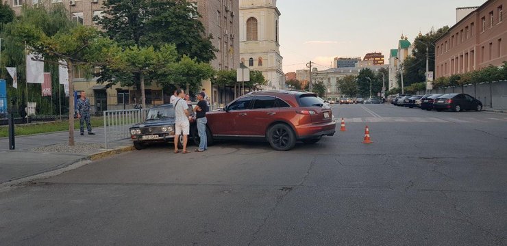 По площади Троицкой в сторону улицы Грушевского ехал бордовый Infiniti. Белый Infiniti двигался по улице Троицкой, поворачивал на площадь и не предоставил преимущество авто на главной. Так произошло столкновение, после которого обе машины отбросило в припаркованный ВАЗ.