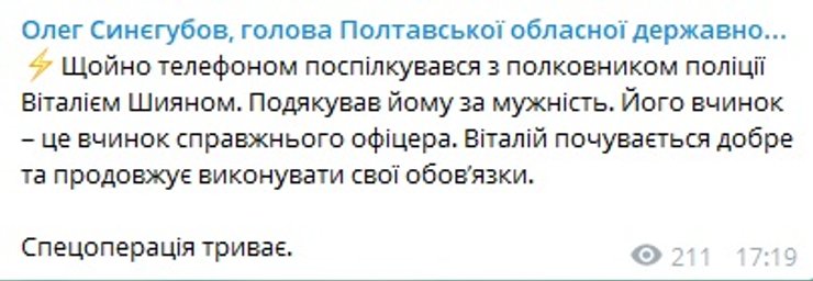 Глава Полтавской областной государственной администрации Олег Синегубов сообщил, что начальник криминального розыска области Виталий Шиян, который предложил себя в качестве заложника Роману Скрыпнику, был отпущен им, и не пострадал.