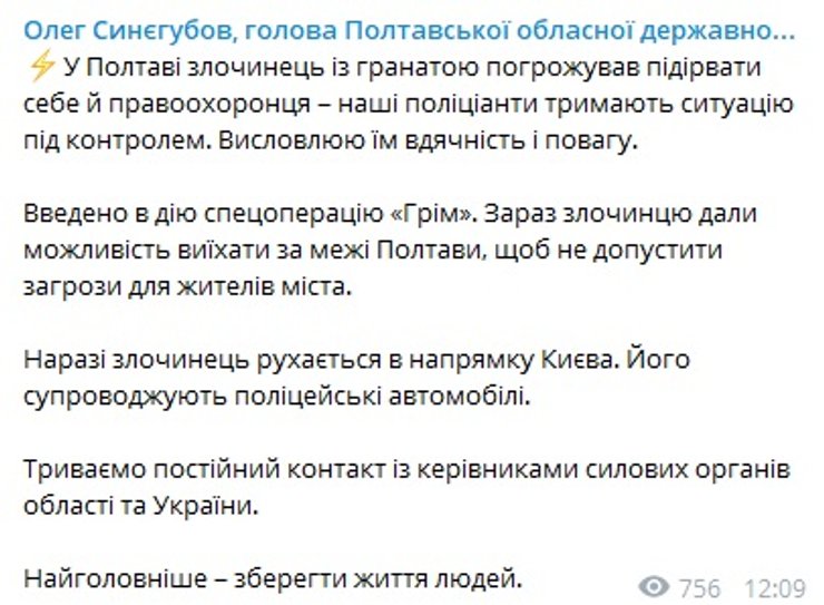 Злоумышленник с заложником выдвинулся в сторону Киева по проселочным дорогам и проехал Решетиловский район. За ним проследовали полицейские машины. Райцентр Решетиловка находится в 50 км от областного центра. Недалеко находится трасса на Киев.