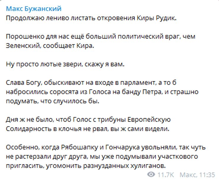 Это не единственный выпад Киры Рудык в адрес Порошенко в этом интервью. Также досталось и его политсиле. На замечание журналиста, что Европейская Солидарность отнимает голоса у партии Рудык на Западе страны, она ответила: "Посмотрите в списки, кого "ЕС" ведет на Западе: это какие-то бандиты и карьеристы. И именно у нашего электората есть глаза, чтобы увидеть, и уши, чтобы услышать". Кроме того, по словам Рудык, у двух партий есть точки соприкосновений по вопросам Росии, войны и "наездов" на украинский язык. "Вопрос коррупции – тут мы сразу оп и расходимся, вопрос Авакова – мы сразу оп и расходимся". А языковой митинг, организованный "Европейской Солидарностью", лидер Голоса поддержала лишь потому, что "мимо проходила".