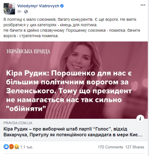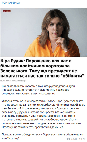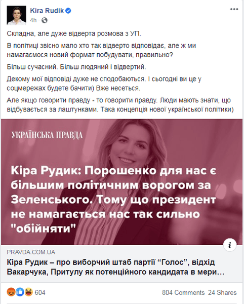 Сегодня, 6 августа, на сайте Украинской Правды вышло интервью главы партии "Голос" Киры Рудык. Оно могло бы остаться незамеченным для украинского Фейсбука, если бы не заявление, что пятый президент Петр Порошенко – больший враг для политсилы, чем Владимир Зеленский