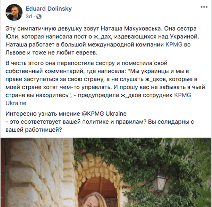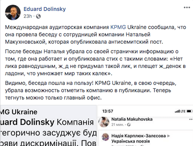 Ранее сотрудница львовского офиса международной аудиторской компании KPMG Ukraine выставила у себя в Facebook записи антисемитского характера. Это заметили другие пользователи соцсети, в том числе Долинский.