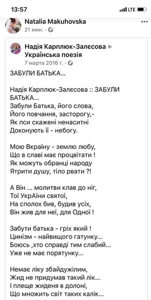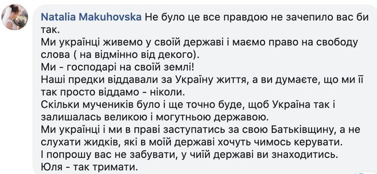 На своей страничке девушка выражала негативную реакцию на еврейское происхождение президента Украины Владимира Зеленского и писала, что украинцы "в праве самостоятельно руководить своей страной, а не слушаться "ж..дков".