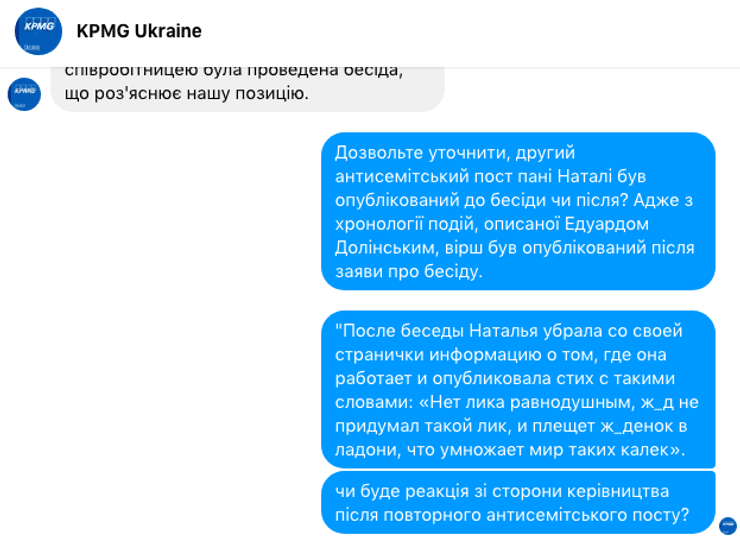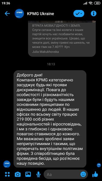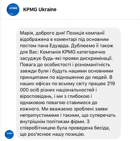 "Як ми вже говорили, ми вважаємо зроблені заяви неприпустимими і несумісними з політикою компанії. Вони суперечать нашим цінностям, нашій корпоративній культурі, нашим принципам. KPMG в Україні рішуче засуджує будь-які форми дискримінації і завжди буде дотримуватися цієї позиції щодо заявленого питання".