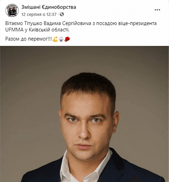На днях "Белоцерковская федерация смешанных единоборств" у себя в Facebook поздравила Титушко с назначением на должность "вице-президента Украинской федерации MMA в Киевской области", однако вскоре эта публикация была удалена.