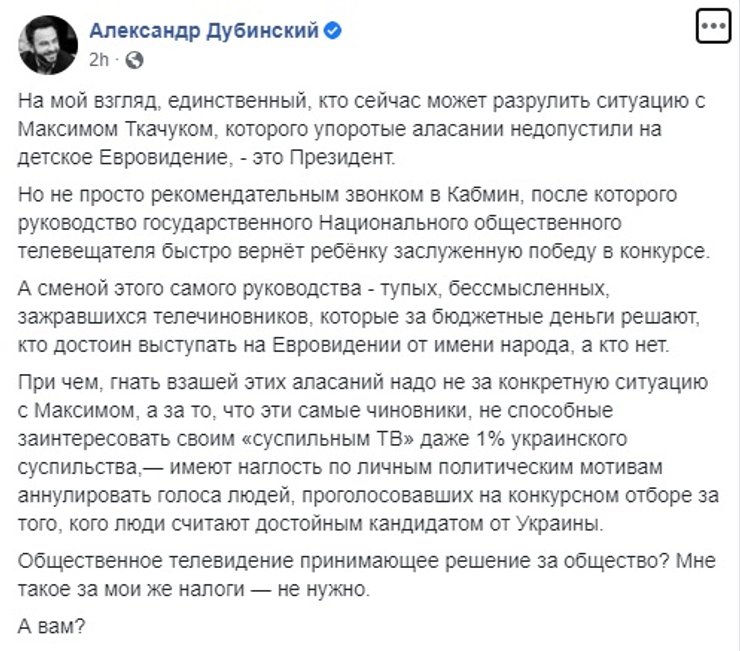 Впрочем, мнение главы НОТУ не очень популярно, в соцсетях считают, что Максим Ткачук должен участвовать в Детском Евровидении, а некоторые нардепы даже считают, что "разрулить" ситуацию может только лично президент Владимир Зеленский.