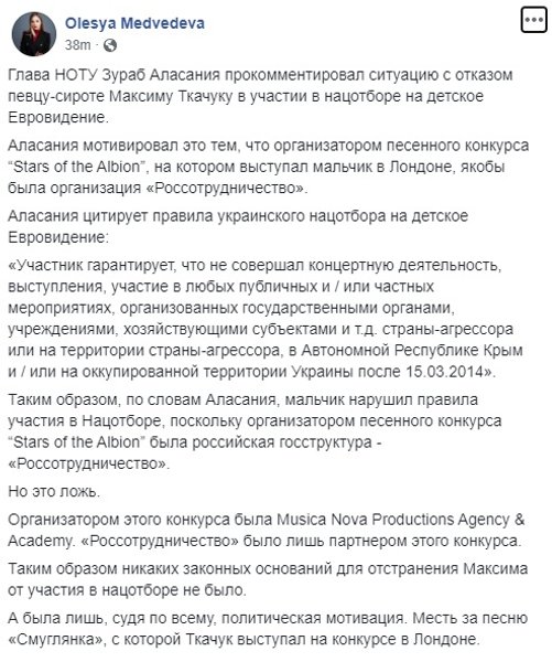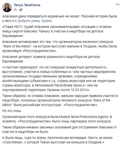 "Конкурс "Stars of the Albion", 28.02.2020 - 01.03.2020 организовал "Русский дом/Представительство Россотрудничества в Лондоне". Эта организация является органом исполнительной власти РФ. Правила нарушены. Участие в Евровидении отменено", - заявил Аласания.