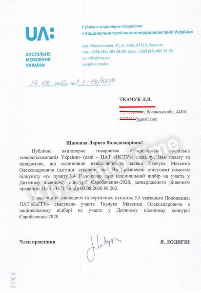 НОТУ (Национальная общественная телерадиокомпания Украины) дала пояснение. Точнее отправила бабушке Максима Ткачука документ, в котором указано, что заявку Максима аннулировали согласно подпункту "г" пункта 3.4 Положения о национальном отборе на участие в Детском песенном конкурсе Евровидения-2020.