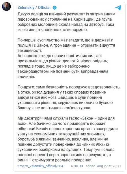 Безнаказанность порождает вседозволенность в Украине, пишет глава государства: "Мы десятилетиями слушали лозунг "Закон – один для всех". Но видим, к чему приводят пустые обещания! ...Мы не должны допустить возвращения в "лихие 90-е" с дерзкими разборками на улицах. Поэтому громкие слова должны наконец превращаться в результат, а виновные – получать реальные наказания".