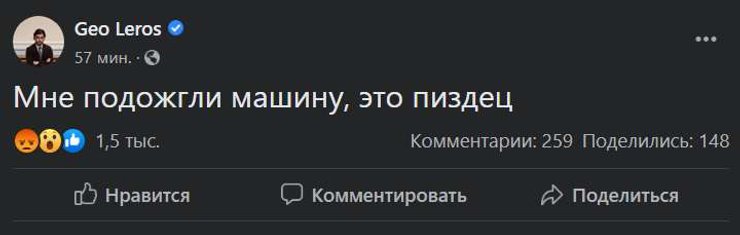 "Свидетели говорят, что был хлопок слышен в квартире 14 этажа. Сомнений уже нет, это был поджог. Кто бы это не сделал, я вас найду, вы рано радуетесь", – написал Лерос в следующем посте.