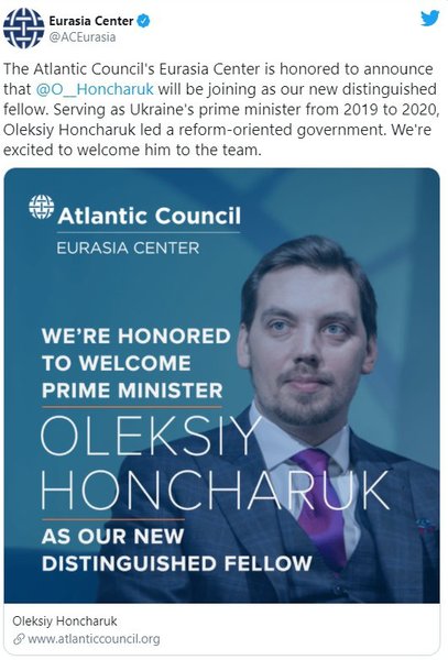 "Центр Евразия" имеет честь объявить, что Алексей Гончарук присоединится к нам в качестве нового заслуженного сотрудника. Находясь на посту премьер-министра Украины в 2019-2020 годах, Алексей Гончарук возглавлял ориентированное на реформы правительство. Мы очень рады приветствовать его в команде", – говорится в сообщении.