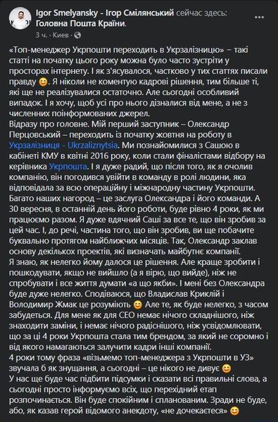 "30 сентября, в последний день его работы, будет ровно 4 года, как мы работаем вместе. Я очень благодарен Саше за все то, что он сделал за это время. И, кстати, часть того, что он сделал, вы еще увидите буквально в течение ближайших месяцев. Так, Александр заложил основу нескольких проектов, которые определят будущее компании", – отметил глава "Укрпочты".