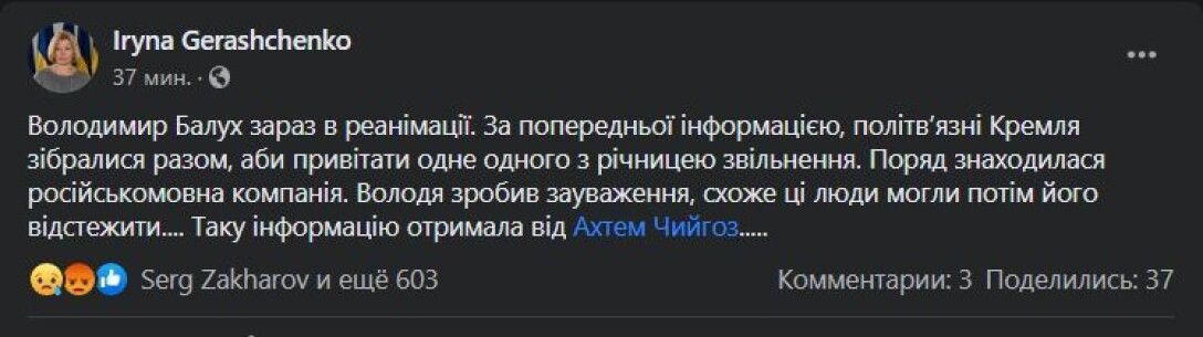 "Владимир Балух сейчас в реанимации. По предварительной информации, политзаключенные Кремля собрались вместе, чтобы поздравить друг друга с годовщиной освобождения. Рядом находилась русскоязычная компания. Володя сделал замечание, похоже эти люди могли потом его отследить... Такую информацию получила от Ахтема Чийгоза", – сообщила Геращенко.