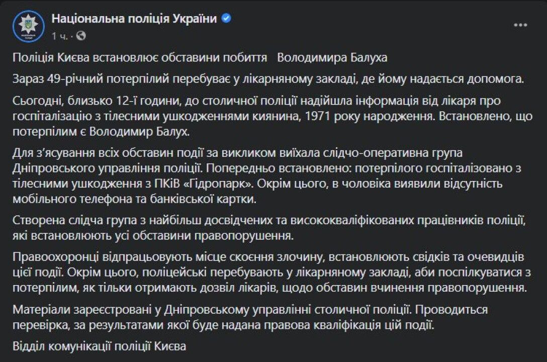 "Сегодня, около 00:00 часов, в столичной полиции поступила информация от врача о госпитализации с телесными повреждениями киевлянина, 1971 года рождения. Установлено, что потерпевшим является Владимир Балух", – написал отдел коммуникации полиции Киева.