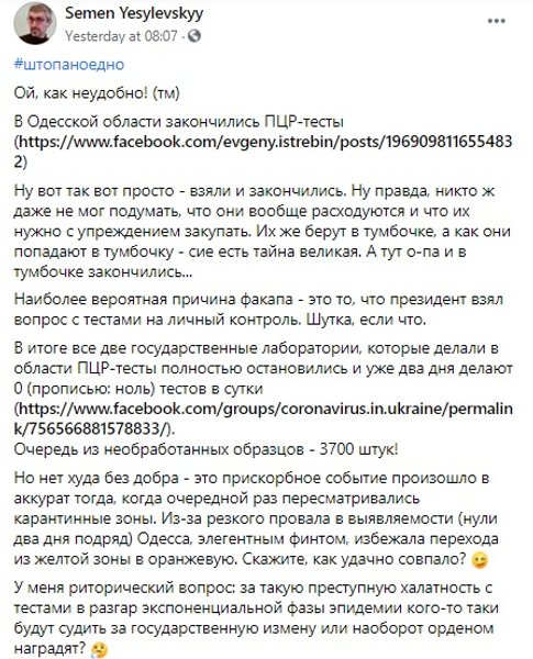 Блогер-медик Семен Есилевский иронизирует на Facebook по поводу резкого одесского дефицита: нет худа без добра. "Это прискорбное событие произошло в аккурат тогда, когда очередной раз пересматривались карантинные зоны. Из-за резкого провала в выявляемости (нули два дня подряд) Одесса, элегентным финтом, избежала перехода из желтой зоны в оранжевую. Скажите, как удачно совпало?" – написал Есилевский.