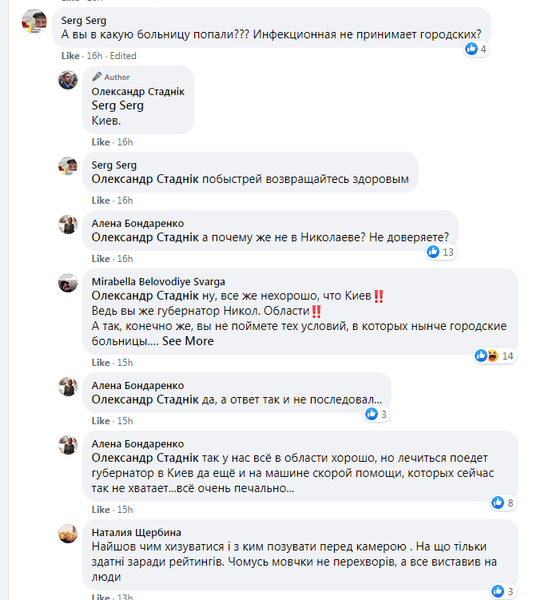 В комментариях Стадник сообщил, что будет лечиться в Киеве, а не в Николаеве. Это вызвало вопросы у горожан. По мнению одного из них, Стадник, приехавший на лечение в Киев, не сможет на себе оценить того уровня лечения заболевших COVID-19, которое сейчас предлагают больницы Николаева.