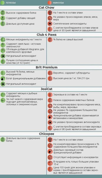 Клуб 4 Лапы Adult Cats Chicken – белков 32 %, жиров – 15%. На 1 месте курятина в виде муки (26%), за ней идут кукуруза и кукурузная клейковина, рис, консервированный токоферолами жир птицы, масло лосося. Содержит свекольную клетчатку, пивные дрожжи, семя льна, комплекс Integramix (сушеные имбирь, томат, банан, боярышник). Цена 1 кг - 82-120 грн., по соотношению цены и качества данный продукт превосходит ближайшие аналоги.