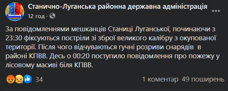 Однако в 01:07 ночи 1 октября на официальной странице Станично-Луганской райгосадминистрации в Facebook появилось сообщение, что к возникновению новых очагов пожара, возможно, причастны боевики с оккупированных территорий. Ссылаясь на информацию от местных жителей представители РГА написали, что с 23:30 фиксировались обстрелы с крупнокалиберного оружия с неприятельских позиций. Снаряды разрывались в районе местного контрольного пункта въезда-выезда (КПВВ), после чего поступило сообщение о пожаре в близлежащем лесном массиве.