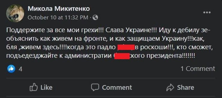 Как пишет общественная организация "Відсіч" у себя в Facebook, Николай Микитенко "в соцсети призвал всех выходить на протест за Украину, как это сделала общественность 24 августа на День Независимости".