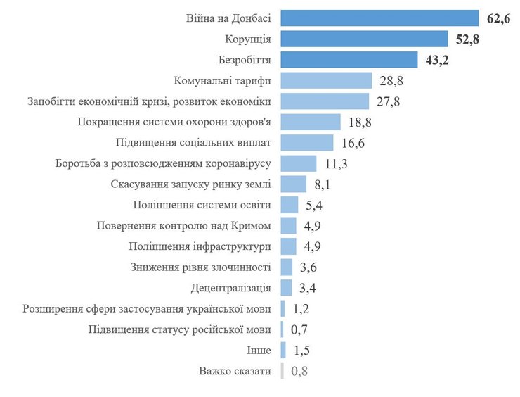 Также опрос КМИС выяснил наиболее волнующие граждан Украины проблемы. В "Топ-3" актуальных бед страны, по мнению участников опроса, которым предлагался перечень из разных проблем, попали: война в Донбассе (ней озабочены 63% респондентов), коррупция (заботит 53% респондентов) и безработица (волнует 43% участников исследования).